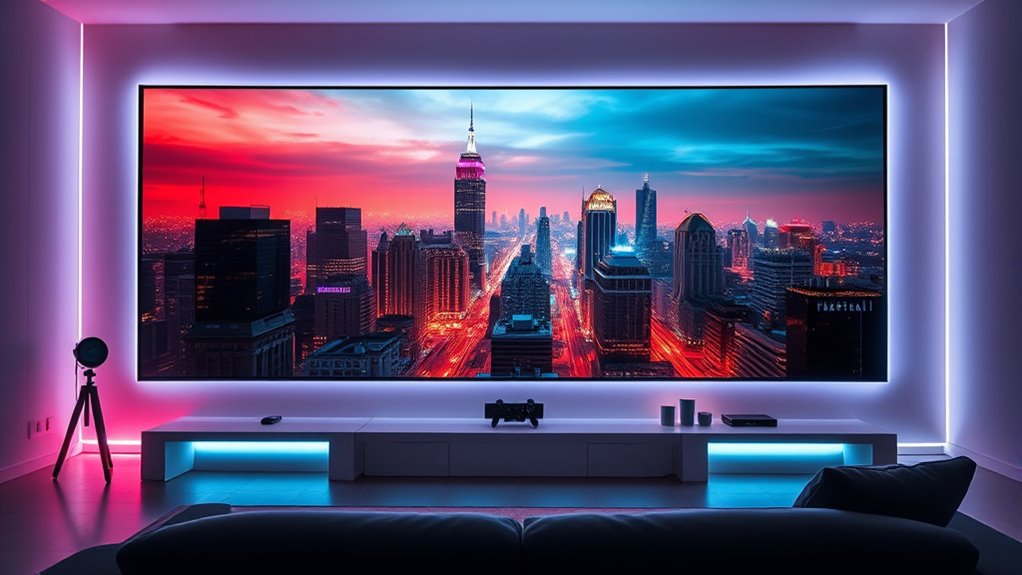 The ideal screen material for gaming clarity is a high-quality, matte white surface with a smooth, uniform finish. I recommend a material with high gain, around 1.0 to 1.5, to enhance brightness without sacrificing contrast. This helps deliver sharp, vivid images with minimal glare. I personally prefer screens designed specifically for gaming, as they provide better color accuracy and clarity, making your gaming experience more immersive and visually stunning.