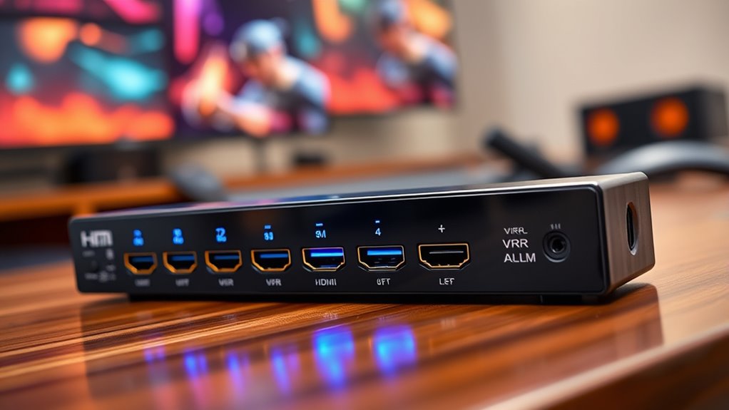 HDMI switches can impact gaming latency and input lag if they aren’t high quality. Poorly designed switches may introduce delays, making your gaming experience feel sluggish. I always look for switches with low latency specs or those specifically designed for gaming, like HDMI 2.1 models supporting VRR and ALLM. A good switch guarantees your signals stay fast and smooth, giving you the best possible response time during gameplay.