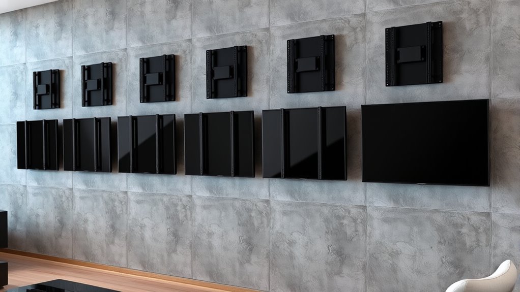 Selecting the right wall mounting type plays a key role in securing your large TV safely and seamlessly. Fixed mounts are designed to hold big screens flush against the wall, typically with a profile of just 1 to 2 inches, creating a sleek, minimalist look. They support heavy-duty construction, attaching securely to wall studs capable of supporting 330 pounds or more. Unlike full-motion or tilting mounts, fixed types offer maximum stability, ideal for big TVs that don’t need adjustments. Proper wall type compatibility is essential—whether concrete, brick, or wood studs—to guarantee safety. Fixed mounts are perfect if you want a clean, unobstructed appearance without adjustable arms or tilts. Choosing the right type ensures your TV stays secure and looks great in your space.