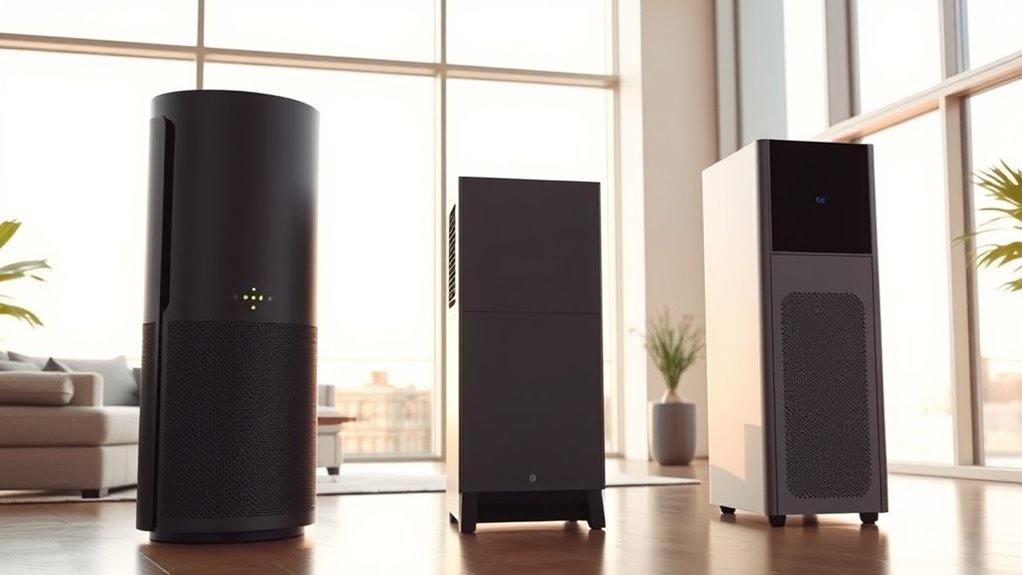 Like a whisper in a quiet forest, these air purifiers operate quietly during sleep and work hours. I’ve found that most models have adjustable settings, allowing me to choose a peaceful mode that minimizes noise without sacrificing air quality. Whether I need a gentle hum or near silence, these purifiers adapt well, making them perfect for maintaining a calm environment while efficiently cleaning large rooms.