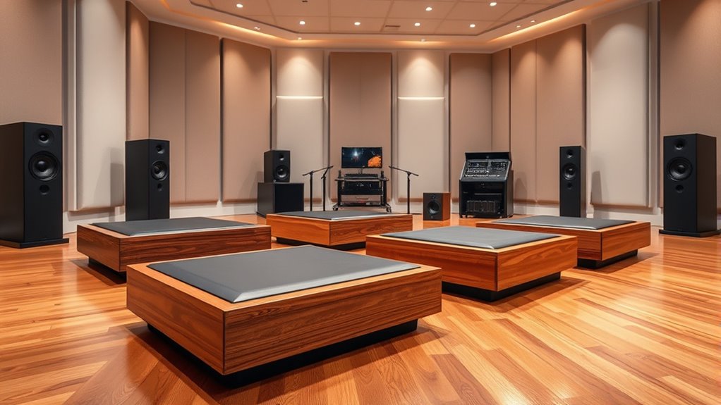 Understanding vibration isolation technology is essential for selecting the right high-end acoustic isolation platform. This technology uses specialized materials like high-density foam and elastomers to absorb and decouple vibrations from your audio equipment. I’ve found that active vibration control systems can enhance this even further, employing sensors and actuators to counteract vibrations in real-time. You’ll want to contemplate how effectively a platform reduces transmitted energy, usually measured in decibels (dB). Platforms designed with specific resonance frequencies can prevent unwanted amplification of vibrations, ensuring clearer sound reproduction. By investing in proper vibration isolation, you can considerably enhance audio clarity, minimize structural noise transfer, and avoid unwanted rattling or feedback from your high-end sound system.