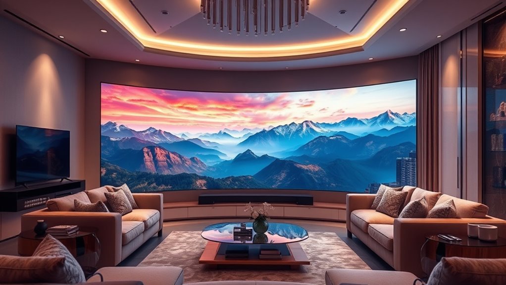 As I explore high-end curved LED displays, the curvature considerably shapes my overall viewing experience. More pronounced curves, like 1500R or 1800R, create an immersive feel that truly envelops me. I appreciate how these screens reduce peripheral distortion and glare, directing light toward my eyes and enhancing visual comfort. With a higher degree of curvature, depth perception improves, providing a natural field of view, especially on large, ultra-wide displays. I also notice that aggressive curves minimize color and contrast shifts at the edges, ensuring consistent image quality. However, I keep in mind that while immersion is fantastic, overly aggressive curves can lead to distortion or make off-center viewing tricky. Balancing these factors is key for an *ideal* experience.