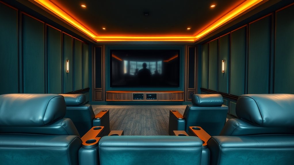 Think of acoustic treatments as the armor that shields your sound. I’ve found that thick, plush carpets and heavy velvet curtains do wonders, absorbing unwanted echoes. Acoustic panels with diffusers and bass traps also help create a balanced soundscape. My advice? Invest in custom-designed solutions to tailor the acoustics precisely—like tuning a fine instrument—ensuring your high-end theater sounds as magnificent as it looks.