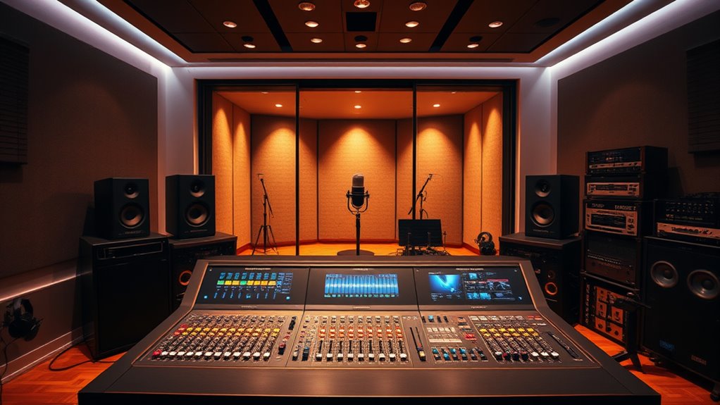 Choosing the right high-end recording studio bundle starts with guaranteeing it seamlessly connects with your existing setup. I always check that the bundle supports my operating system, whether it’s Windows or macOS, for smooth integration. Multiple connectivity options like USB-C, USB 3.0, Thunderbolt, or MIDI are essential to accommodate various devices and peripherals I might use. I also verify that the included software is compatible with my DAWs to avoid any workflow disruptions. Additionally, I make sure the bundle provides necessary adapters or cables—such as XLR, TRS, or optical connections—to prevent extra purchases. Finally, I assess whether the hardware can connect to multiple devices simultaneously, offering flexibility for live streaming, recording, and playback without hassle. This ensures my setup remains efficient and versatile.