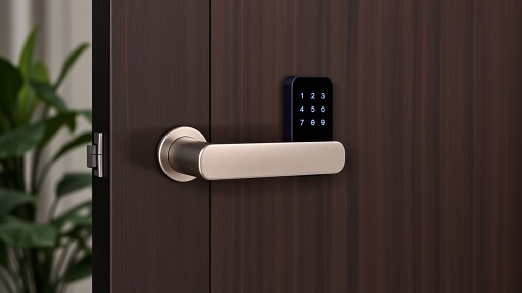 If you’re searching for high-end smart locks that blend security and style, I know a few top options worth your attention. These locks feature sleek designs, durable materials, and multiple unlocking methods like fingerprint, app control, and keypad. They also include advanced security features such as tamper alerts and encryption. By choosing one of these premium options, you get both aesthetics and protection. Keep going, and you’ll discover more about the best models for your home.