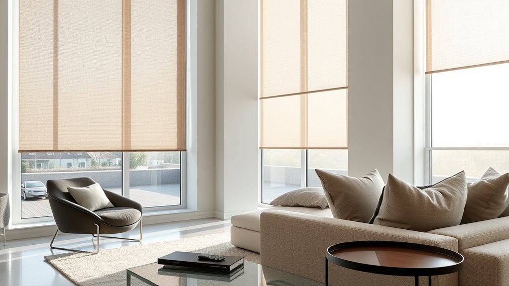 Choosing high-end smart window shades means paying close attention to the quality of the materials and how well they hold up over time. Premium fabrics like blackout textured materials, thermal-insulating textiles, and eco-friendly linen blends resist fading and wear, ensuring your shades stay beautiful for years. High-quality stitching, reinforced edges, and water-resistant coatings add durability, handling daily use and environmental challenges. The motor and hardware components, such as rechargeable lithium batteries and long-lasting Zigbee or Bluetooth motors, also influence longevity and reliability. Materials with UV protection and thermal insulation not only extend the lifespan of the fabric but also safeguard your window frames from sun damage and temperature shifts. Eco-friendly, fade-resistant, and flame-retardant fabrics further enhance safety and aesthetic durability over time.