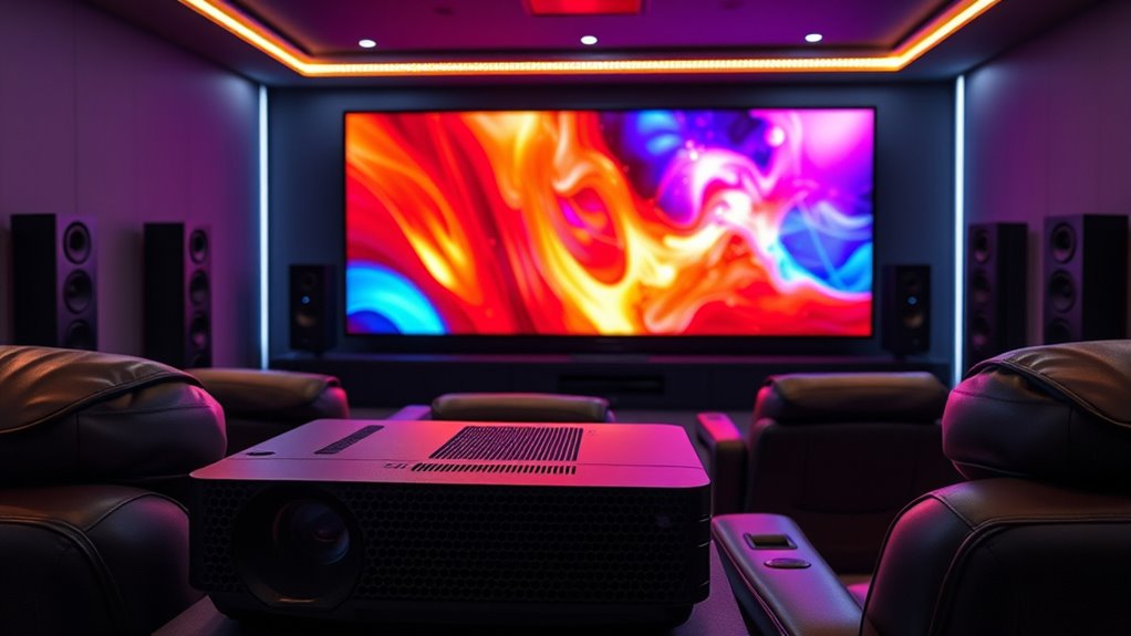 Have you ever noticed how some projectors produce bright, vivid images even in well-lit rooms? That’s largely thanks to higher brightness levels, like 15,000 lumens or more, which guarantee images stay clear and detailed regardless of ambient light. Equally important is contrast ratio; a ratio of at least 10,000:1 helps create deeper blacks and brighter whites, adding depth to your picture. Brightness and contrast work together to produce sharp, vibrant visuals that substantially enhance viewing quality. Advanced technologies, such as high-transmittance lenses and precise LCD calibration, improve these aspects further. Remember, balancing brightness and contrast is key—especially for larger screens or outdoor setups—to achieve ideal clarity and immersive visuals.