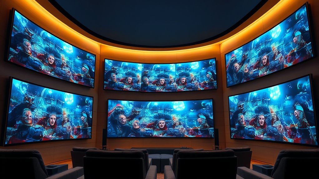 Material quality plays a vital role in the performance of high-ticket curved projection screens, impacting everything from image brightness to durability. I always look for screens made with premium materials like high-gain fabrics or specialized vinyl, as they enhance image clarity considerably. Durability is key; I prefer screens that resist wrinkles, creases, and stretching to guarantee a smooth surface for consistent projection. It’s also important to take into account how the material affects light absorption and reflection—it can make a big difference in contrast ratios and color vibrancy, especially in rooms with ambient light. Anti-glare and anti-wrinkle treatments are essential for maintaining image quality over time, and I often opt for double-sided fabrics for versatile viewing options.