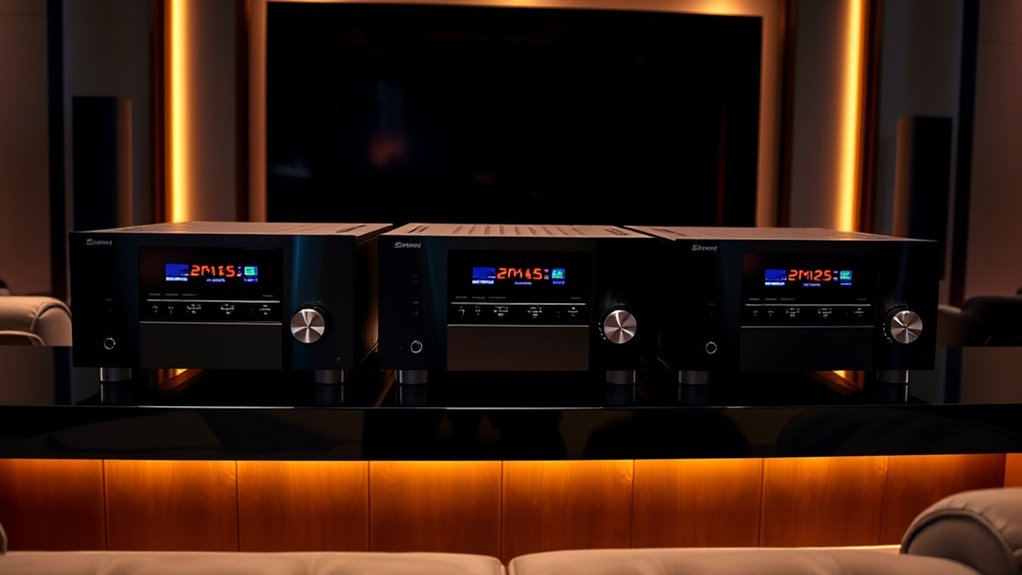 The audio quality features of a high-ticket dual zone AV receiver directly impact your listening experience. These receivers support advanced audio codecs like Dolby Atmos, DTS:X, and Dolby TrueHD, creating immersive, multi-dimensional sound that fills your rooms. Multiple channels, such as 7.2 or 9.2 setups, ensure rich audio spreads across different zones, enhancing both home theater and music listening. High-quality digital-to-analog converters (DACs) deliver clearer sound with minimal distortion, while support for high-resolution formats like FLAC and WAV allows for detailed, lossless music playback. Additionally, sophisticated room calibration technologies optimize sound based on your environment, guaranteeing each speaker performs at its best. These features collectively elevate your audio experience, making every movie, game, or song more vivid and engaging.