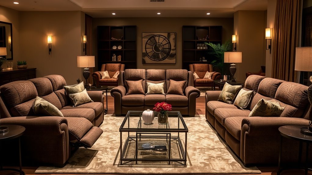 When I look at high-ticket reclining loveseats, I often find materials like genuine leather, high-quality fabric, and durable microfiber. Leather gives a luxurious feel, while fabric options can offer a cozy touch. I also notice sturdy frames made from hardwood or metal for lasting support. It’s essential to take into account the cushioning materials too, like memory foam or high-density foam, as they provide the comfort I crave during long movie nights or relaxation time.