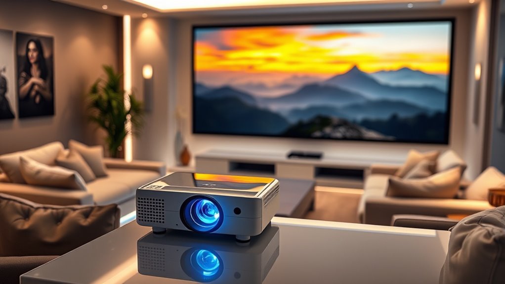 As you explore high-ticket mini LED projectors, you’ll quickly realize that resolution and image quality are crucial for an exceptional viewing experience. Opting for higher resolutions like 1080p or 4K ensures you get sharper, more detailed images with vibrant colors. The advanced LED technology also boosts brightness and contrast, making your images clearer even in well-lit spaces.