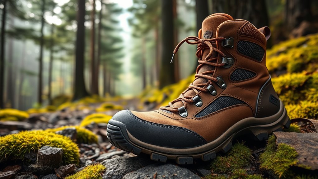 Choosing hiking boots that last requires paying attention to the materials used in their construction. I look for boots with reinforced elements like full-grain leather, synthetic overlays, or abrasion-resistant fabrics, which stand up to rough terrains and resist tearing. The outsole material, usually rubber or thermoplastic rubber (TPR), is key for durability, offering long-lasting traction and resisting wear. Double-stitched or sealed seams help prevent splitting and keep moisture out, extending the boot’s lifespan. I also consider how well the upper resists environmental elements like water, mud, and UV rays, ensuring they hold up in different conditions. Regular maintenance, such as cleaning and waterproofing, can further boost the durability of these materials, keeping my boots in top shape for many hikes.