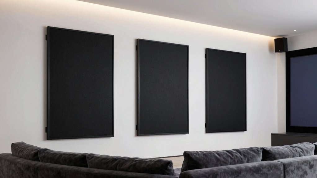 Achieving superior sound quality in in-wall home theater systems hinges on selecting high-performance drivers like 6.5-inch woofers and silk dome tweeters, which deliver rich bass and crisp highs. These drivers provide the foundation for clear, balanced audio across the entire frequency spectrum. To enhance clarity, modern systems incorporate DSP tuning and optimized crossover designs that minimize distortion and guarantee smooth blending between drivers. Materials like titanium diaphragms and high-temperature voice coils improve sound accuracy and durability, making the listening experience immersive and reliable. Proper speaker placement and wide dispersion design are vital for even sound distribution, reducing dead spots and maintaining clarity throughout the room. Additionally, high sensitivity ratings (95dB or higher) enable louder, clearer sound with less power, boosting overall audio quality.