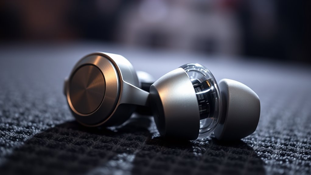 Choosing the right in-ear monitors for drumming depends heavily on fit and comfort, as they need to stay secure during energetic performances without causing discomfort. Proper fit guarantees they conform snugly to your ear canal, blocking out unwanted noise and preventing slips. Soft materials like silicone or memory foam help achieve that perfect seal while remaining comfortable for long sessions. An ergonomic design tailored to your ear shape can reduce fatigue and pressure points, making extended practice easier. Adjustable ear hooks and flexible earpiece angles boost stability during vigorous movements. Regularly replacing or customizing ear tips keeps the fit consistent and prevents slippage, maintaining sound quality and comfort. Prioritizing fit and comfort ensures you can focus on your performance without distraction or discomfort.