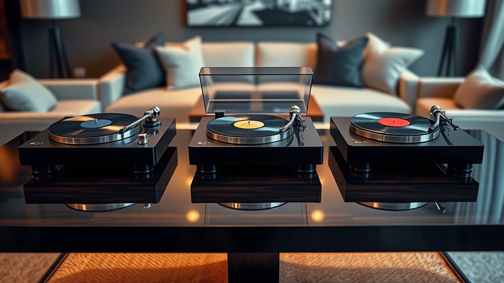 Choosing the right space for your luxury vinyl playback bundle requires careful planning to guarantee ideal performance. First, confirm the area can comfortably fit your turntable and additional equipment like speakers and amplifiers. The layout should allow easy access for operation and maintenance, avoiding cramped or cluttered spots. Check that the setup area has suitable power outlets and proper grounding to support high-quality playback without interruptions. It’s also important to evaluate the acoustic environment; minimizing vibrations and external noise will notably improve sound clarity. Finally, make sure the surface supporting your turntable is stable and level. A wobbly or uneven surface can cause record skipping or damage. Proper space and setup are essential for a premium listening experience that truly showcases your vinyl collection.