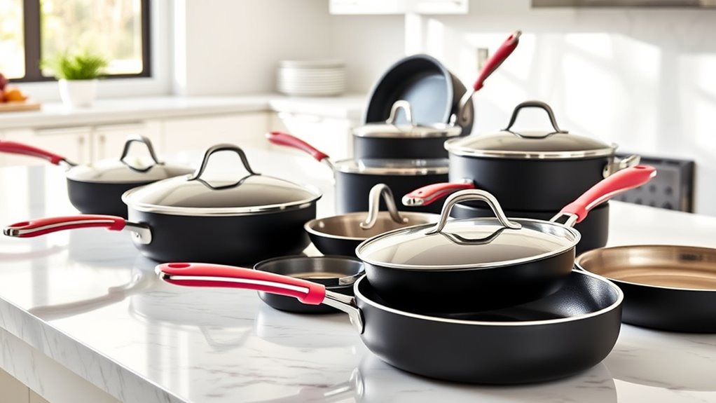 Matching your nonstick cookware set to your cooktop type is essential for peak performance and longevity. Different cooktops require specific materials to guarantee proper heat transfer and efficiency. For induction stoves, look for cookware with a magnetic stainless steel base or layered construction, as non-magnetic materials won’t work with induction technology. If you have gas or electric cooktops, most cookware options will perform well, but it’s still important to confirm compatibility. Ceramic and glass cooktops benefit from cookware with flat, smooth bottoms that distribute heat evenly. Always check the manufacturer’s specifications to confirm the set explicitly states compatibility with your cooktop type. This helps prevent warping, damage, and guarantees your cookware lasts longer while providing optimal cooking results.