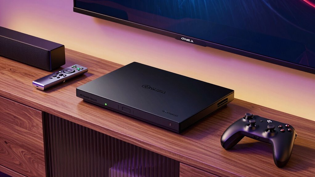 Just like a well-tuned orchestra creates harmony, choosing the right accessories transforms your Nvidia Shield into a home theater masterpiece. I remember upgrading my setup, and suddenly, every movie felt like a personal cinema. With these top accessories, you’ll elevate your experience, making every binge, game, or movie night unforgettable. Think of it as adding the perfect seasoning—small changes that turn a good meal into a memorable feast. Your home theater deserves that magic.
