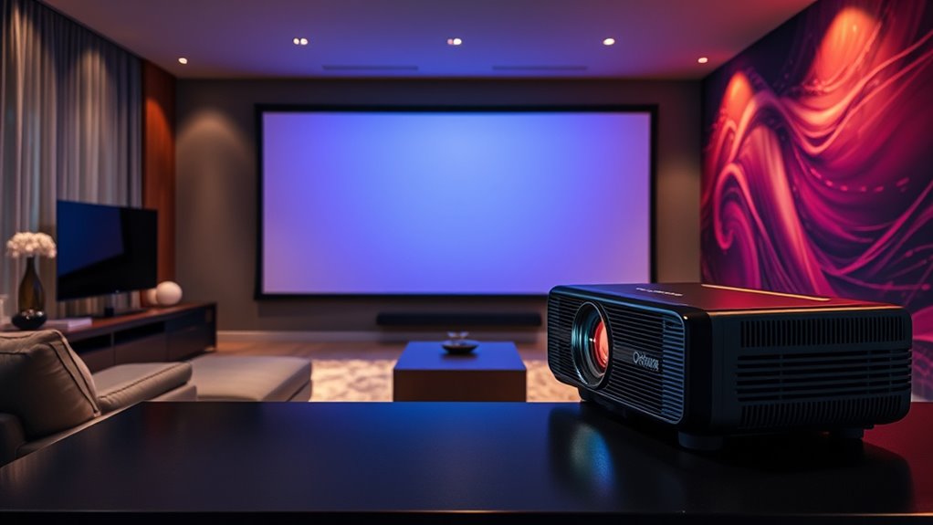Have you ever wondered how much space you need to set up an Optoma long throw projector for your desired screen size? The projection distance typically ranges from 8 to 20 feet, depending on the model, allowing you to create screens larger than 100 inches diagonally. This distance range is vital because it affects how flexible your setup can be, especially in rooms with limited space. Most long throw projectors offer adjustable lens shift and zoom features, helping you fine-tune the image size and position. To get the best image quality, make sure your room layout matches the projector’s recommended distance. Staying within this range prevents distortion or wavy visuals, ensuring a crisp, immersive viewing experience.