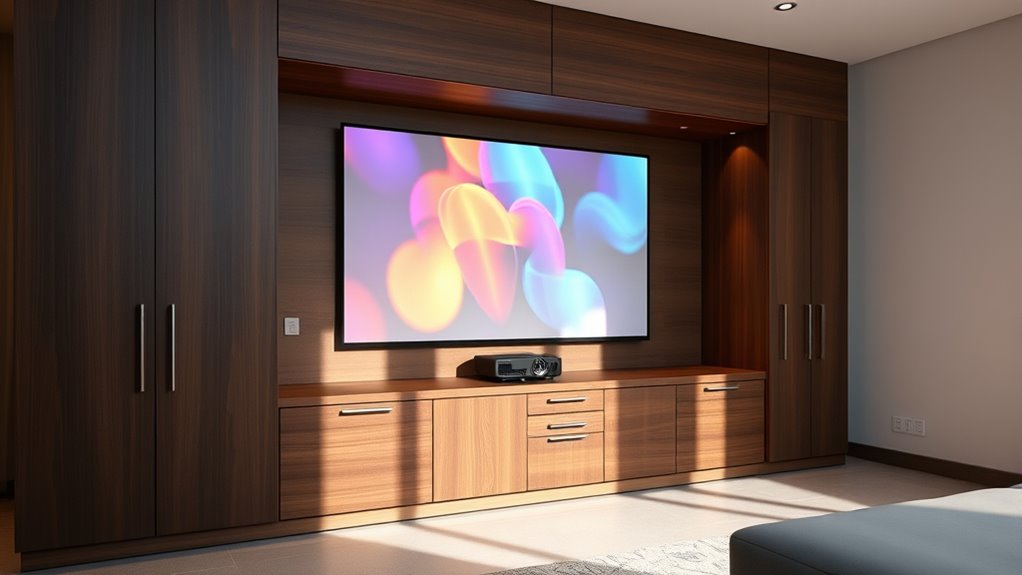 Did you know that soundproof cabinets can reduce noise by up to 50%? To minimize acoustic interference, I look for cabinets with sound-insulating materials like dense foam or mass-loaded vinyl. I also choose designs with sealed doors and ventilation systems that avoid sound leaks. Ensuring the cabinet’s construction blocks sound from escaping helps keep my viewing experience clear and undisturbed.