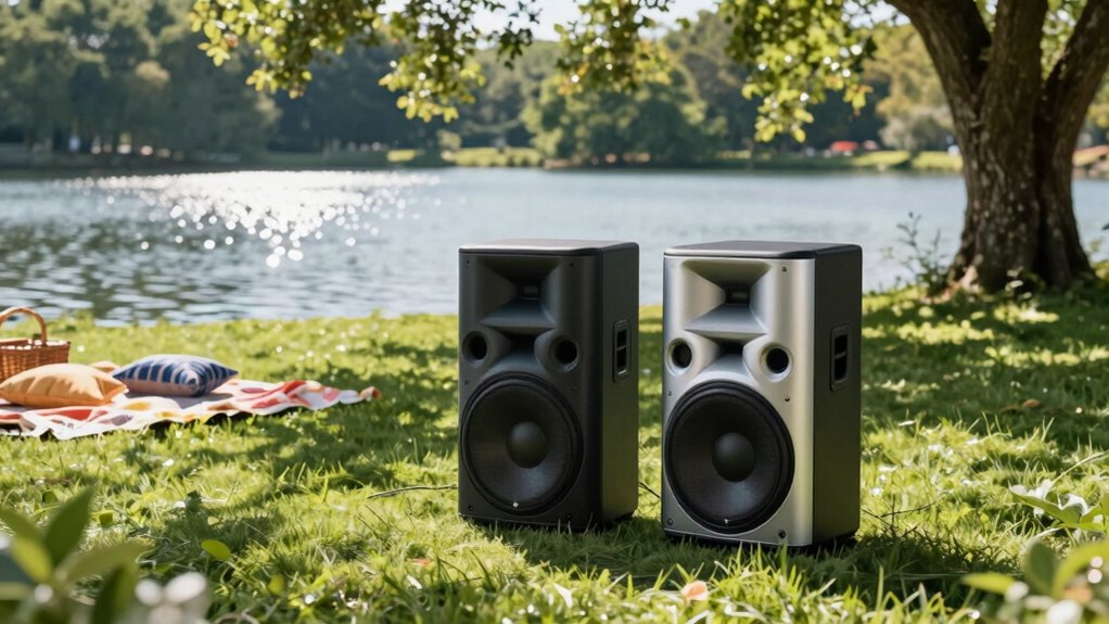 Yes, outdoor speakers can be easily moved or repositioned, especially if they’re portable or lightweight. I find it simple to shift them around to optimize sound or accommodate different outdoor setups. However, some built-in or permanently mounted models might require tools or professional help. For flexibility, I recommend choosing portable, weatherproof speakers with sturdy handles or mounts, making adjustments quick and hassle-free without risking damage.