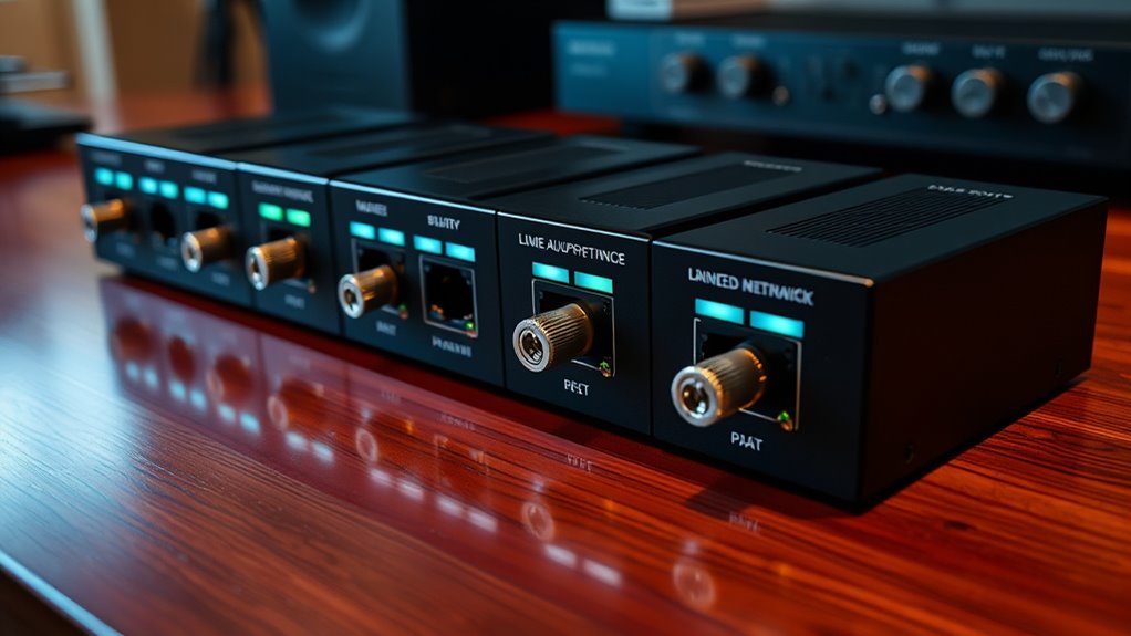 Reducing noise interference is vital for preserving audio fidelity in premium audiophile network switches. High-quality shielding and grounding techniques are indispensable, as they minimize electromagnetic interference (EMI) and radio frequency interference (RFI), which can distort audio signals. Using low-noise, linear power supplies instead of switch-mode power supplies helps reduce electrical noise, guaranteeing cleaner data transmission. Carefully designed PCB layouts with dedicated ground planes and isolated signal paths prevent internal signal coupling and interference. Additionally, high-precision clocks and optimized clock distribution circuits greatly lower timing jitter, maintaining audio accuracy. The switch’s enclosure and internal components are also designed to dampen vibrations and external electromagnetic disturbances. All these factors work together to guarantee the purest, most accurate sound possible.