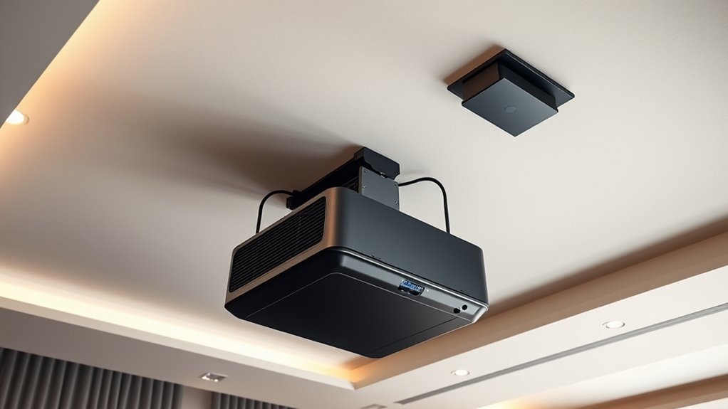 To maintain superior image quality with ceiling mounts, I regularly check the projector’s alignment and guarantee it’s securely fixed. I keep the lens clean and free of dust, and I adjust the focus whenever needed. Additionally, I control ambient lighting to prevent glare and reflections. Proper ventilation also prevents overheating, which can affect performance. Consistent maintenance helps me enjoy a clear, sharp picture every time I watch.