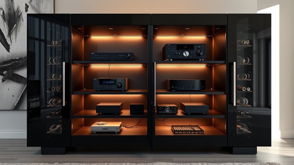 Think of my premium AV cabinet as a fortress for your gear—safety is built in. It includes features like tempered glass doors that resist shattering, sturdy locks to keep curious hands out, and ventilated panels to prevent overheating. I also guarantee cables stay organized and out of harm’s way. This combination of safety measures protects your equipment and provides peace of mind, so you can focus on enjoying your entertainment.