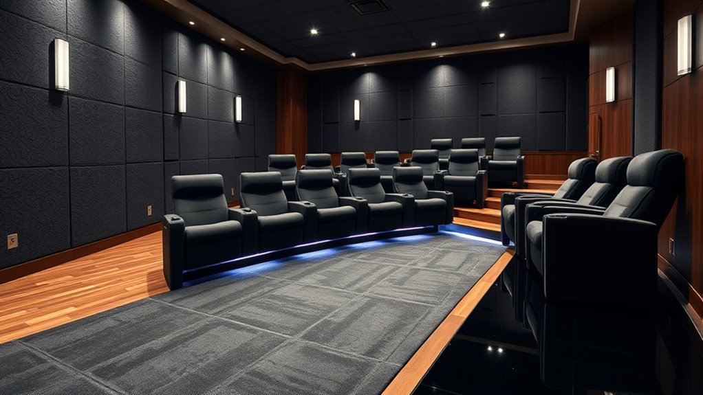 Choosing the right home theater flooring can make a significant difference in acoustic performance, as sound transmission and reverberation heavily depend on the materials and installation methods used. High-density vinyl flooring with underlayment like IXPE can cut down sound transfer and enhance clarity. Interlocking vinyl tiles with foam backing help dampen vibrations and minimize echo, creating a more immersive sound environment. Adding plush rugs or carpets over premium flooring absorbs sound waves, reducing reverberation and improving audio quality. Floating floor systems that decouple from the subfloor prevent vibrations from affecting speakers and overall acoustics. Proper sealing and soundproofing materials also contain sound within the room, preventing leakage and ensuring a clear, crisp soundstage. These factors collectively boost your theater’s acoustic performance.