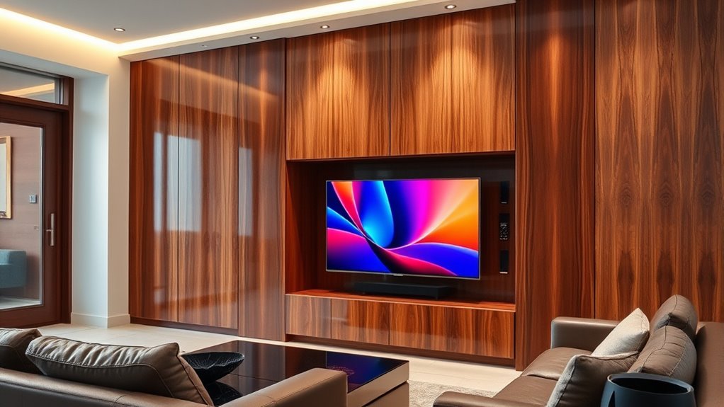 Premium motorized TV lifts come with several safety features to guarantee secure operation. I appreciate the built-in sensors that detect obstacles, stopping the lift instantly to prevent accidents. Many models also include soft-close mechanisms, reducing the risk of pinched fingers. Additionally, there are remote controls with child lock functions and sturdy locking mechanisms when the lift is in the lowered position, offering peace of mind for safe use in any home.