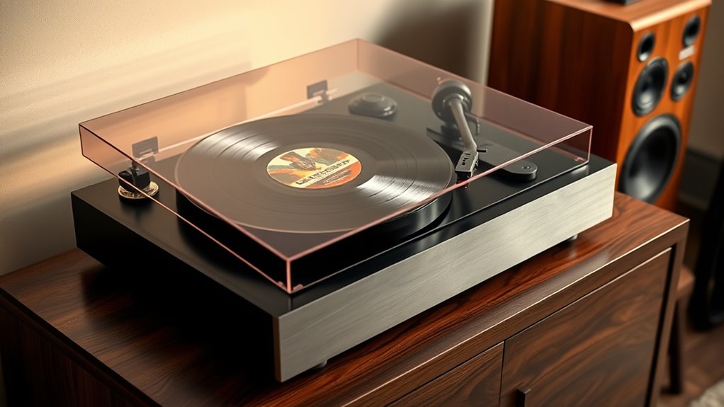 To keep my premium record player in top shape, I regularly clean the stylus with a brush and use a record cleaning kit for my vinyls. I also check the belt tension and make sure the turntable is level. Plus, I keep it away from dust and direct sunlight. These simple steps help maintain ideal sound quality and extend its lifespan, making my listening experience consistently excellent.