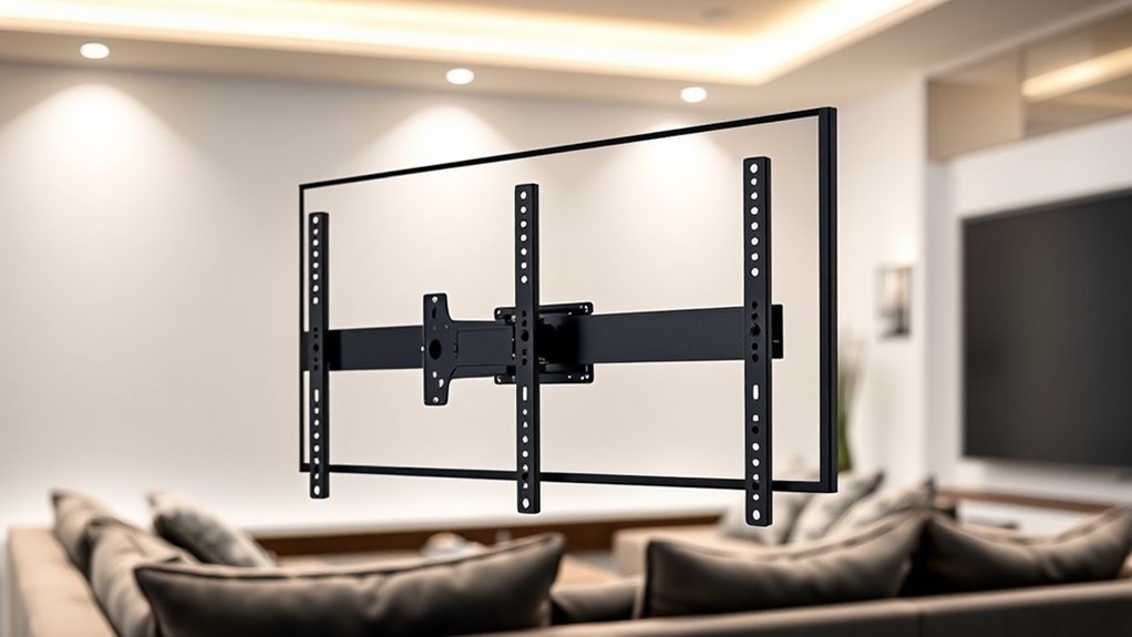 Security features are a key consideration to guarantee your TV stays safely mounted over time. I always look for mounts with robust locking mechanisms or security screws to prevent accidental or intentional removal. Confirming that the mount is UL-listed or safety-tested gives me confidence it can support my TV’s weight and size securely. Heavy-duty materials like thick steel or reinforced joints are essential for stability, reducing wobbling or bending. If I’m placing the mount in a public or shared space, I opt for lockable arms or anti-theft locks. Proper installation is critical—I make sure to anchor the mount into sturdy wall studs or solid concrete. These measures ensure my TV remains secure, stable, and protected against accidents or theft.
