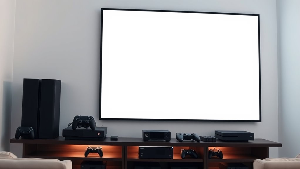 Ever wondered how a projector’s connectivity options can impact your overall experience? The right connections guarantee seamless setup and effortless device integration. Premium ultra-low latency projectors should support multiple options like HDMI, USB, Ethernet, and wireless protocols such as WiFi 6 or Bluetooth 5.2. These enable quick, reliable connections to gaming consoles, PCs, and media devices, reducing lag and buffering. Screen mirroring technologies like Miracast, Chromecast, and AirPlay make wireless content sharing straightforward from smartphones or tablets. Multiple input ports, including HDMI 2.1 and USB-C, provide versatility for different devices. Compatibility with smart home systems and voice assistants like Alexa or Google Home adds convenience, allowing voice control and automation. Overall, robust connectivity options are essential for a smooth, integrated gaming and streaming experience.