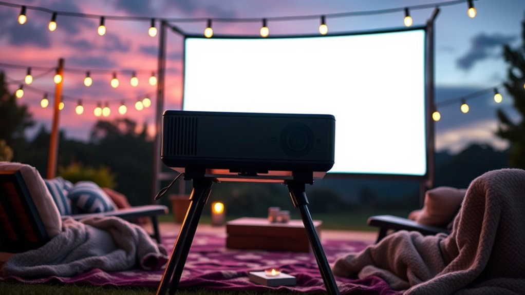 So, whether you’re setting up for a backyard blockbuster or dreaming of a 2026 outdoor movie night, choosing the right projector stand makes all the difference—kind of like having a trusty steed for a modern knight. With options from adjustable tripods to portable screens, you’re all set to enjoy cinematic magic under the stars. Remember, a good stand is your secret weapon—think of it as your Excalibur for epic outdoor movie adventures.