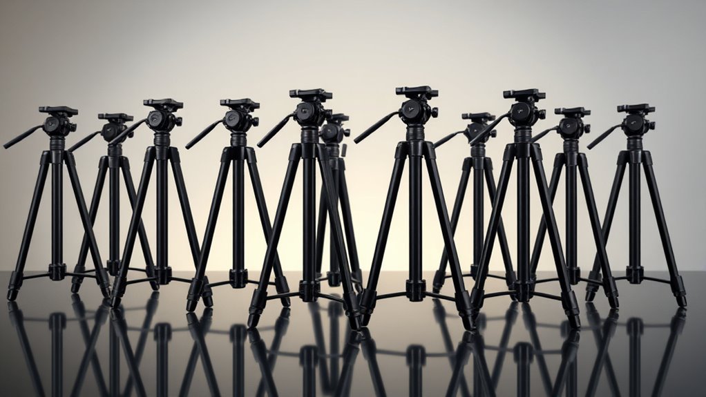 Safety features on indoor heavy-duty tripods are like a safety net, catching any potential mishaps. I look for features like locking mechanisms, anti-slip feet, and stability braces that prevent wobbling. Some models even include bubble levels for perfect alignment and quick-release locks for easy setup. These features give me peace of mind, knowing my equipment stays secure and my environment remains safe during presentations or events.