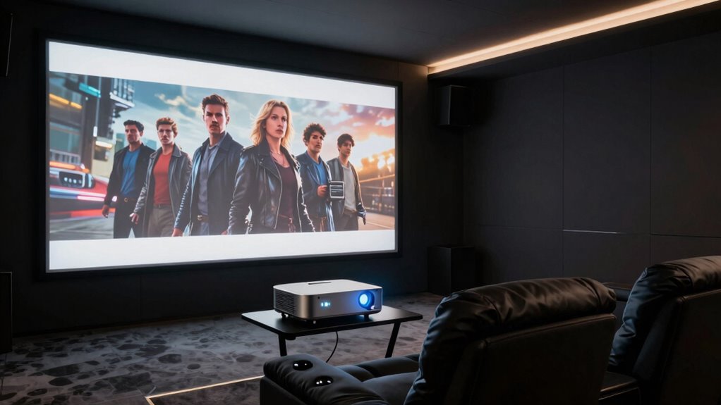 Brightness and contrast considerably impact how vibrant and detailed your 4K Blu-ray movies appear on a projector. Higher brightness, measured in ANSI lumens, guarantees images stay clear and vivid, even in well-lit rooms. This is essential for enjoying movies with rich detail without needing complete darkness. A high contrast ratio, like 20,000:1 or more, creates deeper blacks and brighter whites, adding depth and realism to the picture. It’s important to note that brightness alone isn’t enough—without good contrast, blacks can look gray, diminishing overall image quality. HDR support further boosts contrast, expanding luminance and color range for more immersive visuals. For best results, aim for at least 2,000 lumens and a contrast ratio of 10,000:1 or higher to handle varied lighting conditions effectively.