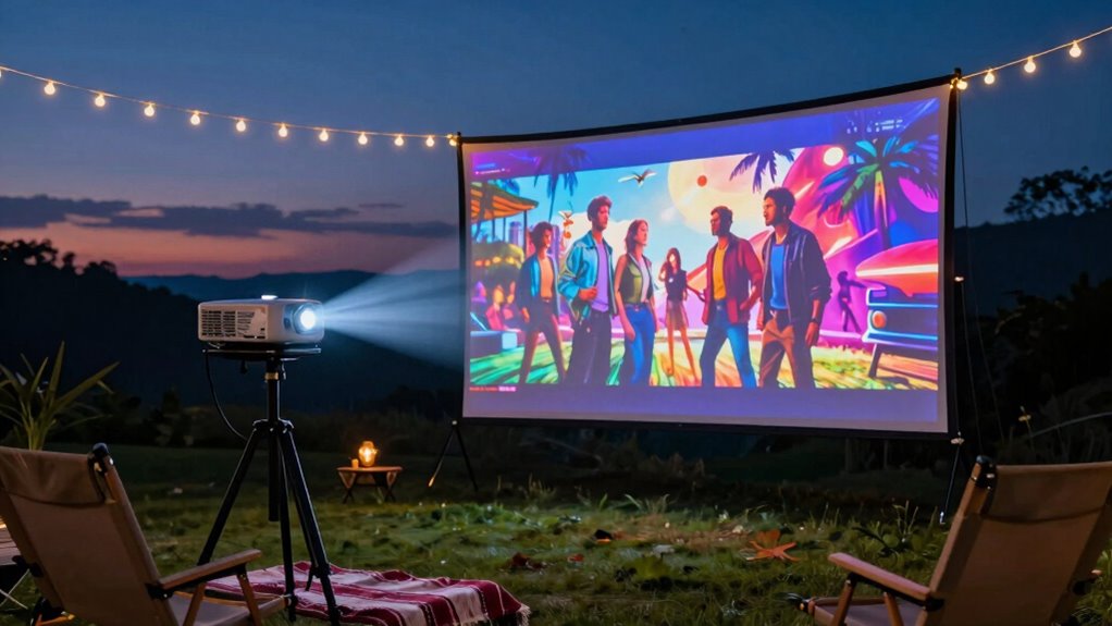 Choosing a projector with the right image clarity and resolution is essential for outdoor movie nights, especially in bright environments. Higher resolutions like 1080p or 4K deliver sharper, more detailed images that make outdoor viewing more immersive. Native resolution is critical—using a native 1080p projector guarantees clear visuals without relying on upscaling, which can reduce image quality. Brightness levels of at least 2,500 lumens are recommended to guarantee the picture remains vivid in well-lit settings. Contrast ratio also plays a fundamental role; ratios of 10,000:1 or higher create deeper blacks and more vibrant colors, enhancing overall image depth. Advanced features like auto focus and keystone correction help keep the picture sharp and properly aligned, even on uneven outdoor surfaces.