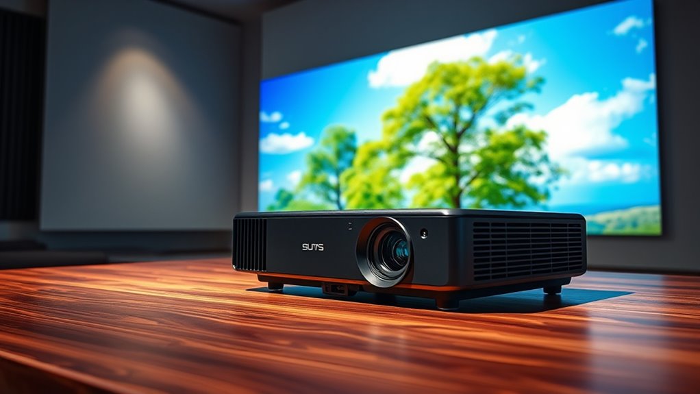 When it comes to displaying true colors in daylight, high ANSI lumen projectors are designed to handle bright environments effectively. I’ve found that with sufficient brightness, these projectors can produce vivid, accurate colors even in well-lit rooms or outdoor settings. However, to get the best color accuracy, I recommend using a high-quality screen and adjusting the settings for color calibration. This way, you’ll enjoy bright, true-to-life images regardless of ambient light.