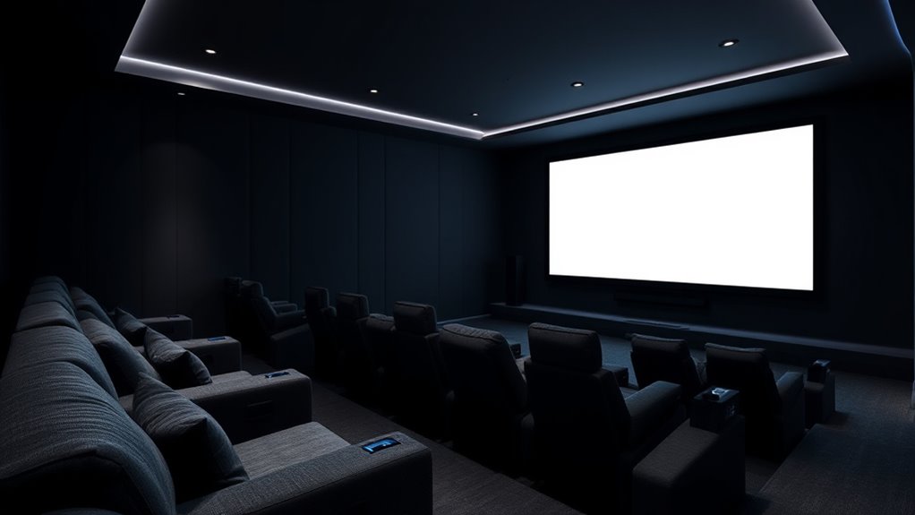 Fan noise control plays a significant role in maintaining a quiet viewing experience, especially since fans are often the primary source of noise in projectors. When choosing a quiet 4K projector, I look for models with noise levels between 20-30dB, which guarantees minimal disturbance. Advanced cooling systems and sealed optical engines can greatly reduce fan noise by decreasing airflow requirements. Sound-dampening materials and smart fan housings further help keep noise low during extended use. I also consider projectors with efficient heat dissipation technologies that lower fan speeds, minimizing noise during normal operation. Some models feature auto-adjusting fan speeds, increasing only during demanding tasks. These factors collectively contribute to a quieter, more immersive home theater experience.