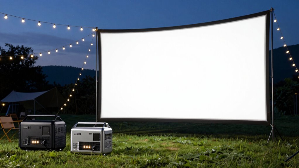 Choosing a quiet portable generator for outdoor movie nights means paying close attention to noise levels, as they directly impact the viewing experience and neighbor relations. Ideally, the generator should operate at or below 60 dB to prevent disturbances. Noise levels around 50 to 55 dB are perfect, as they’re comparable to normal conversation or background music. Generators rated at 59 dB or lower at 23 feet help guarantee a peaceful environment during your movie screening. For sensitive areas, ultra-quiet models producing less than 52 dB are the best choice. Remember, checking the decibel rating at the specified distance is vital because noise levels can vary based on measurement points and surroundings. Keeping noise within limits preserves the ambiance and keeps everyone happy.
