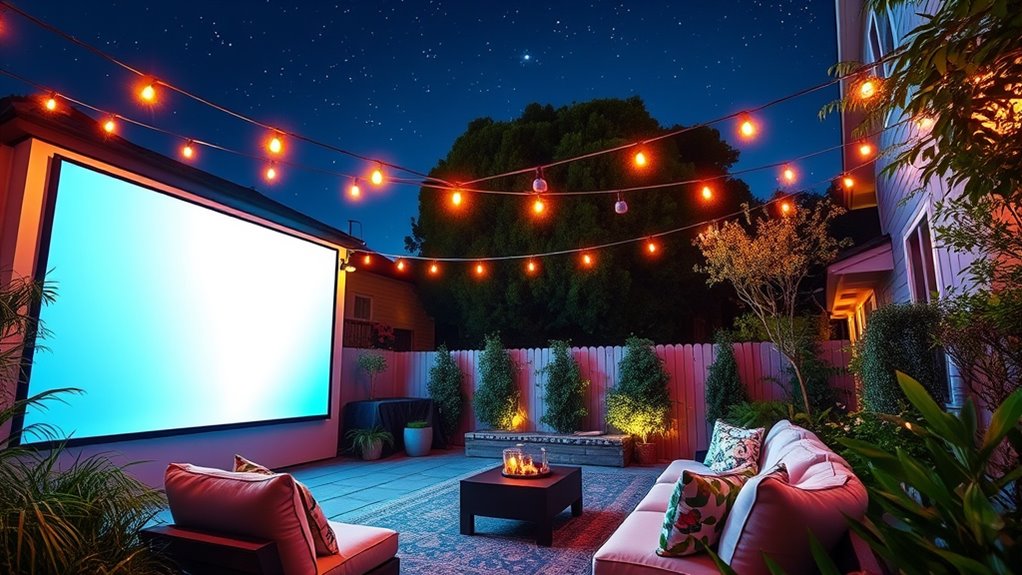 Did you know that a 100-inch screen is the most popular size for outdoor movie setups? I find that an ideal screen size is between 100 and 120 inches, offering a cinematic experience without overwhelming the space. I recommend considering your backyard dimensions and projector throw distance to find the perfect fit. This size balances immersion and practicality, making your outdoor movie nights truly unforgettable.
