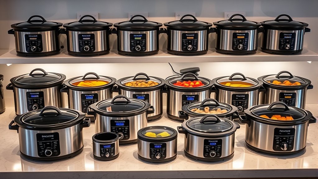 Choosing the right capacity and size for a programmable slow cooker is vital to guarantee it meets your cooking needs without wasting space or energy. Slow cookers typically range from 4 to 8 quarts, affecting how many servings you can prepare. Larger sizes (6-8 quarts) are perfect for family meals or entertaining, while smaller ones (4 quarts) suit couples or small households. Think about your usual recipes and batch sizes to avoid overcrowding or underuse. Also, consider your kitchen space; the cooker should fit comfortably on your counter or in storage. Keep in mind that bigger models may consume more energy, so balancing capacity with efficiency is essential. Selecting appropriately sized equipment ensures you get the most out of your slow cooker without unnecessary waste.