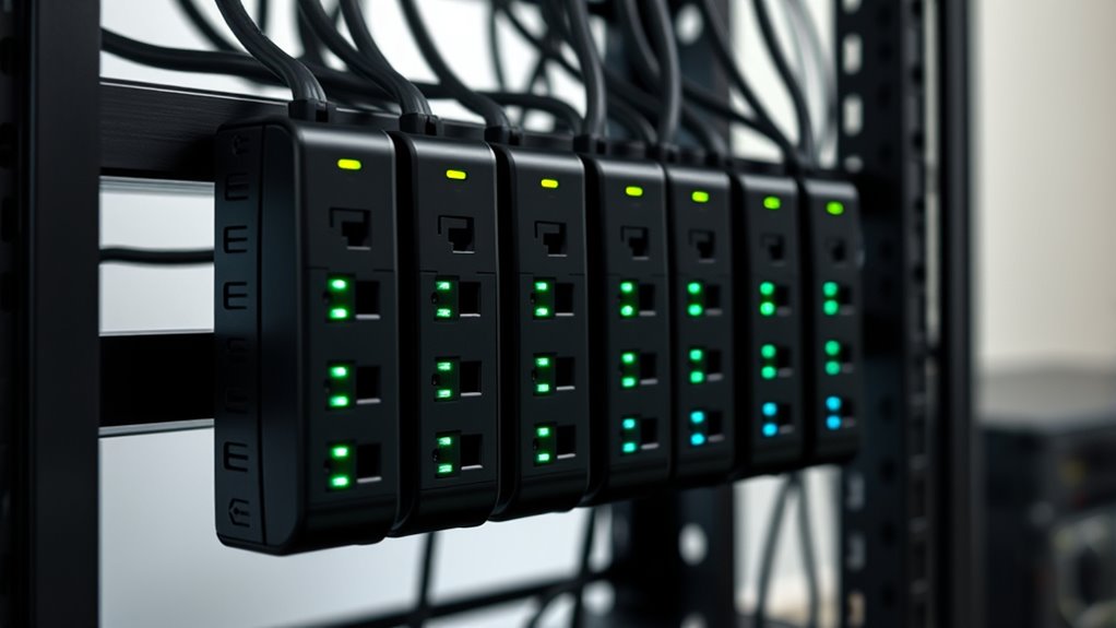 Ever wonder how much power your AV devices actually consume? Energy monitoring features in smart power strips give you real-time data on each connected device’s power usage. This helps identify which devices are high consumers, so you can optimize their operation and cut down on energy costs. Plus, with companion apps, you get detailed insights into your usage patterns over time, making it easier to spot inefficiencies. Accurate monitoring also allows for proactive maintenance by detecting abnormal power spikes that might signal device issues. Some smart strips even let you set consumption thresholds and alerts, preventing overloads and ensuring safety. Overall, these features empower you to manage your AV rack’s energy more efficiently and cost-effectively.