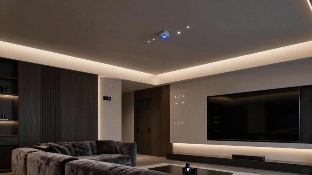Presence sensors pack in security features like instant alerts if someone enters unexpectedly, ensuring I stay in control. They can recognize authorized users, preventing intrusions, and even turn off devices if suspicious activity is detected. I love how they seamlessly integrate with my security system, making my media room not just smarter, but fiercely protected. It’s like having a vigilant security guard watching over everything 24/7, giving me peace of mind.