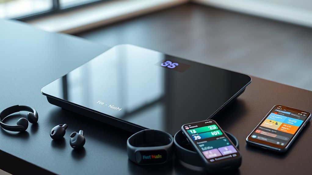Choosing a smart scale with the right connectivity options and compatibility can make a big difference in how smoothly you track your progress. I look for scales that sync seamlessly with my preferred fitness apps like Apple Health, Google Fit, or Fitbit, ensuring all my data stays in one place. Depending on my setup, I prefer Bluetooth for quick, manual syncing or Wi-Fi for automatic updates without hassle. Multi-user profiles and automatic recognition are essential if multiple people use the scale, as this guarantees accurate data for everyone. I also check if the scale displays real-time metrics on an integrated screen or if I need to open an app. Ultimately, secure data transmission is a must to protect my privacy during syncing and storage.