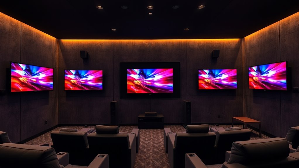 If you’re looking for the top Sony ALR screens for a truly immersive home theater, I recommend checking out options that support 4K/8K, high gain, and ambient light rejection. Features like motorized floor rise and app or voice control make setup easier, while design aspects guarantee vivid, bright images even in well-lit rooms. To find the perfect fit for your space and preferences, keep going—I’ve got details on each one that can help you decide.