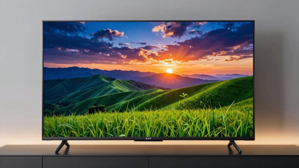 Since immersive sound markedly enhances the viewing experience, paying attention to audio performance is essential when selecting a TV with Dolby Vision and HDR10+ under $3000. Look for models with Dolby Atmos or DTS:X support, as these deliver multidimensional sound that fills the room. High-quality built-in speakers are a plus, but pairing your TV with a soundbar or wireless speakers via Bluetooth can notably boost audio quality. Features like Enhanced Dialogue Mode are also valuable, improving speech clarity against complex soundtracks. Dynamic metadata in HDR10+ ensures audio adjustments are synchronized with scene changes, creating a more immersive experience. Ultimately, prioritizing these audio features guarantees richer, clearer sound that complements the stunning visuals of your TV.