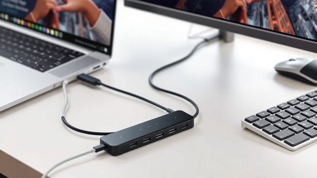 Handling multiple high-bandwidth data transfers with USB-C hubs is impressive. I’ve found that quality hubs use advanced chipsets and multiple Thunderbolt or USB 3.x ports, allowing simultaneous transfers without lag. They allocate bandwidth efficiently, ensuring your devices like external drives, monitors, and accessories work seamlessly. Just remember, the hub’s overall bandwidth capacity determines its performance, so investing in a higher-spec model guarantees smooth, multi-device connectivity without compromising speed.