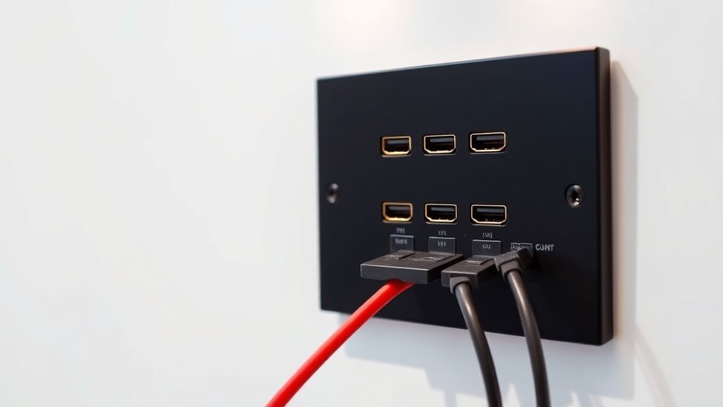 Matching your HDMI passthrough to your room’s decor can make a significant difference in creating a clean, polished look. I recommend choosing a wall plate color and style that complement your space to guarantee seamless integration. Pay attention to the size and shape of the plate; it should fit well within your wall box without protruding or disrupting the aesthetic. A minimal, clean design helps hide cables and keeps the area tidy. Look for finished surfaces that resist scratches and discoloration to maintain their appearance over time. Additionally, select a faceplate and connector design that blend smoothly with surrounding wall features, avoiding cluttered or obtrusive elements. These choices enhance both functionality and visual harmony in your entertainment setup.