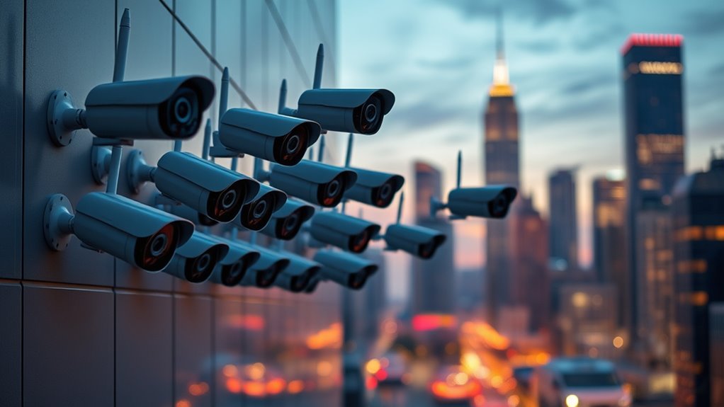 Weather can greatly impact wireless security camera performance. I’ve noticed rain, snow, or fog can obscure the lens, reducing image clarity. Extreme temperatures can also affect battery life and electronic components, causing cameras to malfunction or lose connection. To guarantee ideal performance, I recommend choosing cameras with weatherproof ratings, proper placement away from harsh elements, and regular maintenance, especially during severe weather conditions.